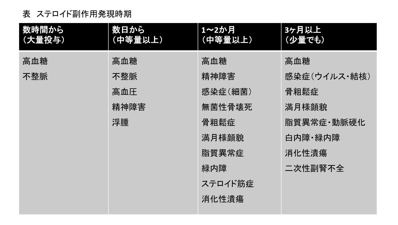 はっちゃん 病院薬剤師 No Twitter ステロイド副作用発現時期 改訂第3版 ステロイドの選び方使い方ハンドブックより一部改変 普段みるなぁ みたことあるなぁって副作用は高血糖 不眠 ムーンフェイス 骨粗鬆症 骨折 感染症 Pcp 緑内障 消化性潰瘍かなぁ 僕