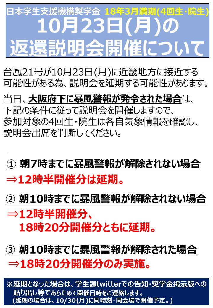 大阪芸術大学 学生課 On Twitter 奨学金 23日 月 に予定している日本学生支援機構奨学金返還説明会についてのお知らせです 台風21号の接近に伴う延期の可能性があります 対象者 2018年3月に満期を迎える4年生 大学院生 は掲示をご確認ください