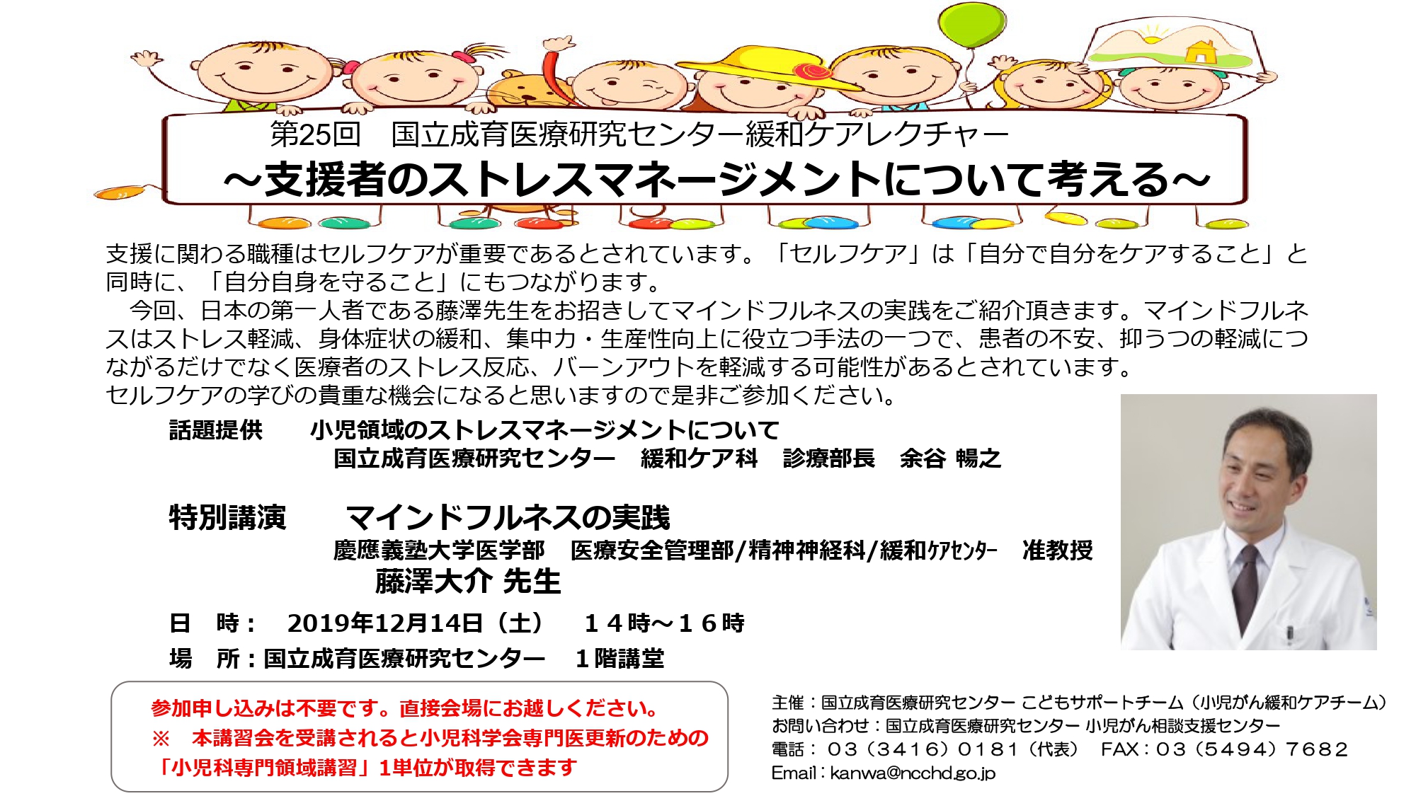 国立成育医療研究センター Pa Twitter 緩和ケアレクチャーのお知らせ 今回のテーマは セルフケア 支援に関わる職種の方々は このセルフケアがとても重要です 本講習会を受講されると小児科学会専門医更新のための 小児科専門領域講習 1単位が取得でき