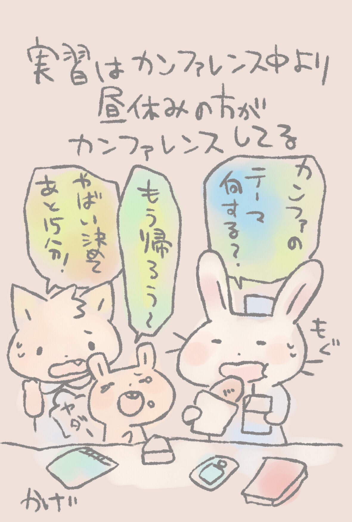 看護師のかげさん イラスト看護帖書籍化 A Twitter 看護学生うさみたん 看護学生の病院実習は指導者 師長 と先生と学生で カンファレンスをします テーマを学生が決めてカンファをすることもあり だいたいが午後に開催されるので昼休みにテーマを決めたりします