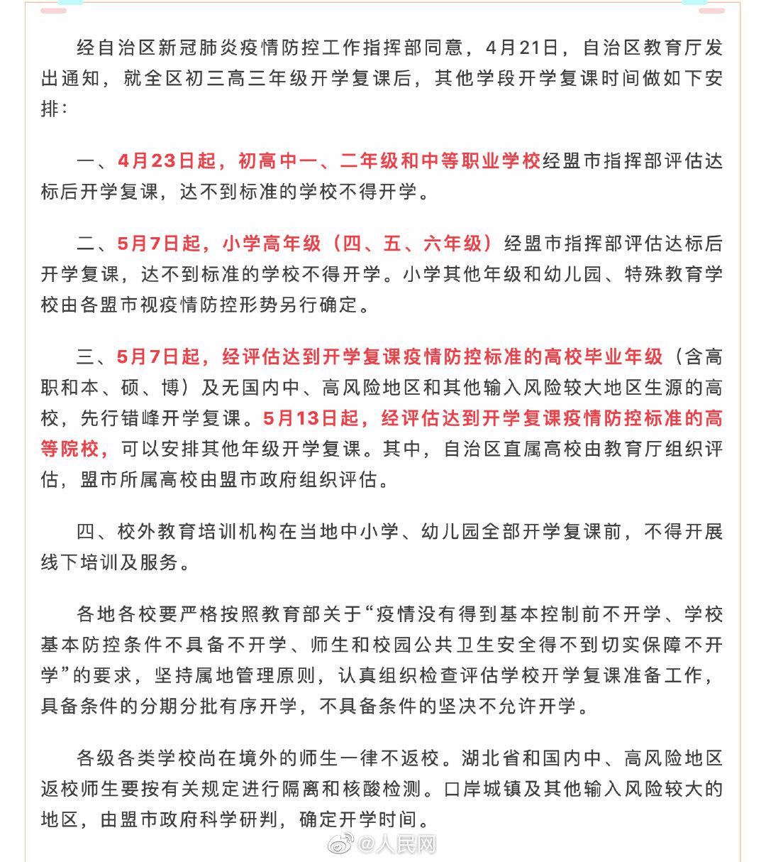 內蒙古中學4月23日開學高校畢業年級5月7日開學